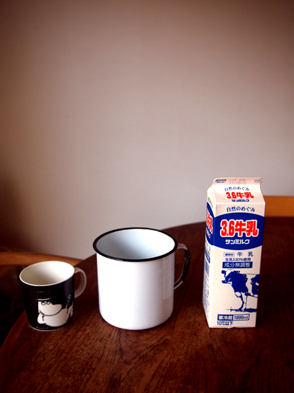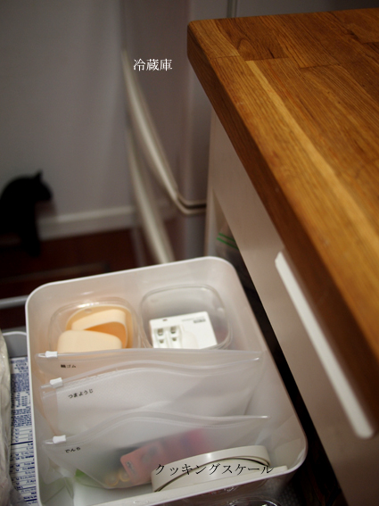 スケールを台に置いて、冷蔵庫から粉を取り出し計る。