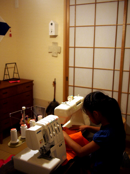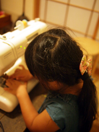 お姉ちゃん、ミシンで作業中。