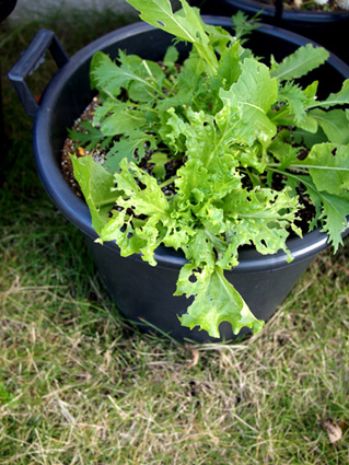 1ヶ月ほど前に植えたフリルレタス、水菜、ベビーリーフが食べごろです。