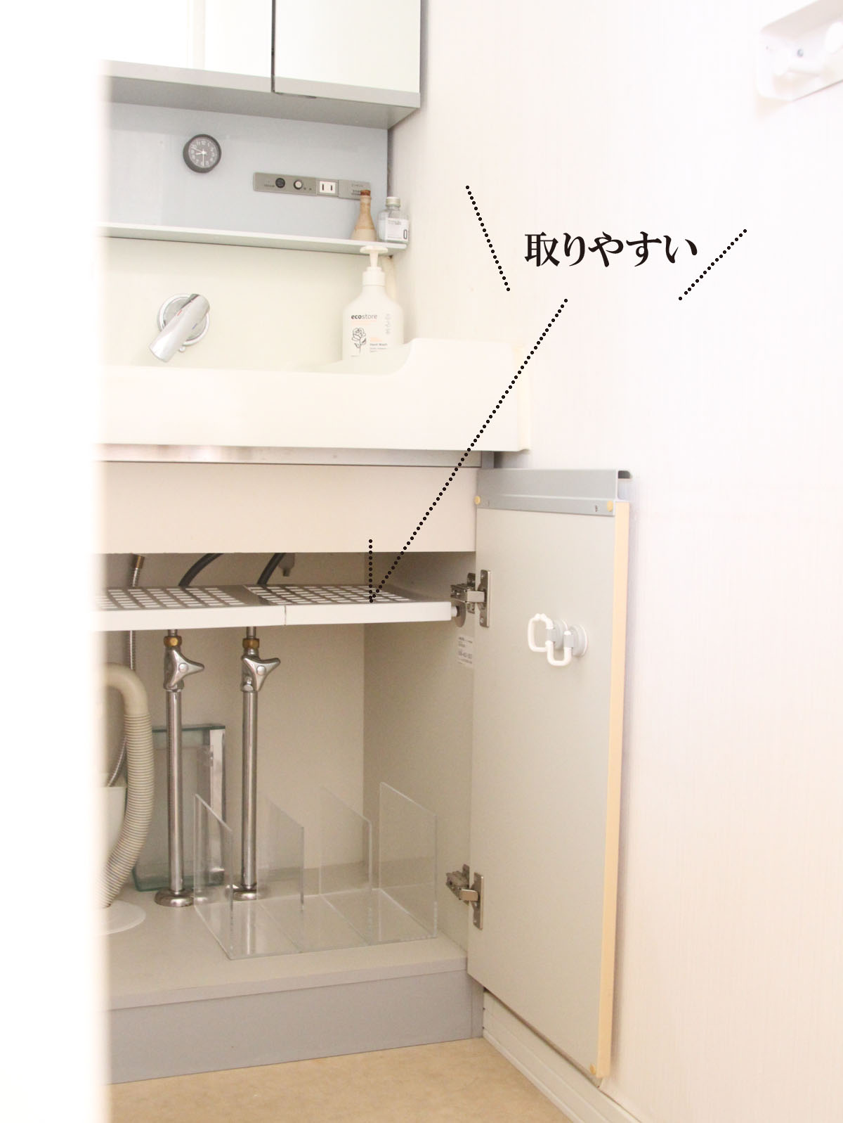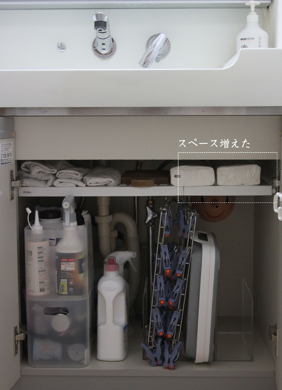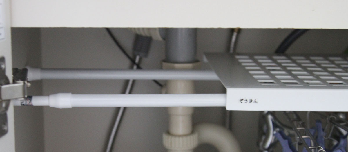 「つっぱり棒用棚」で洗面所の収納スペースに