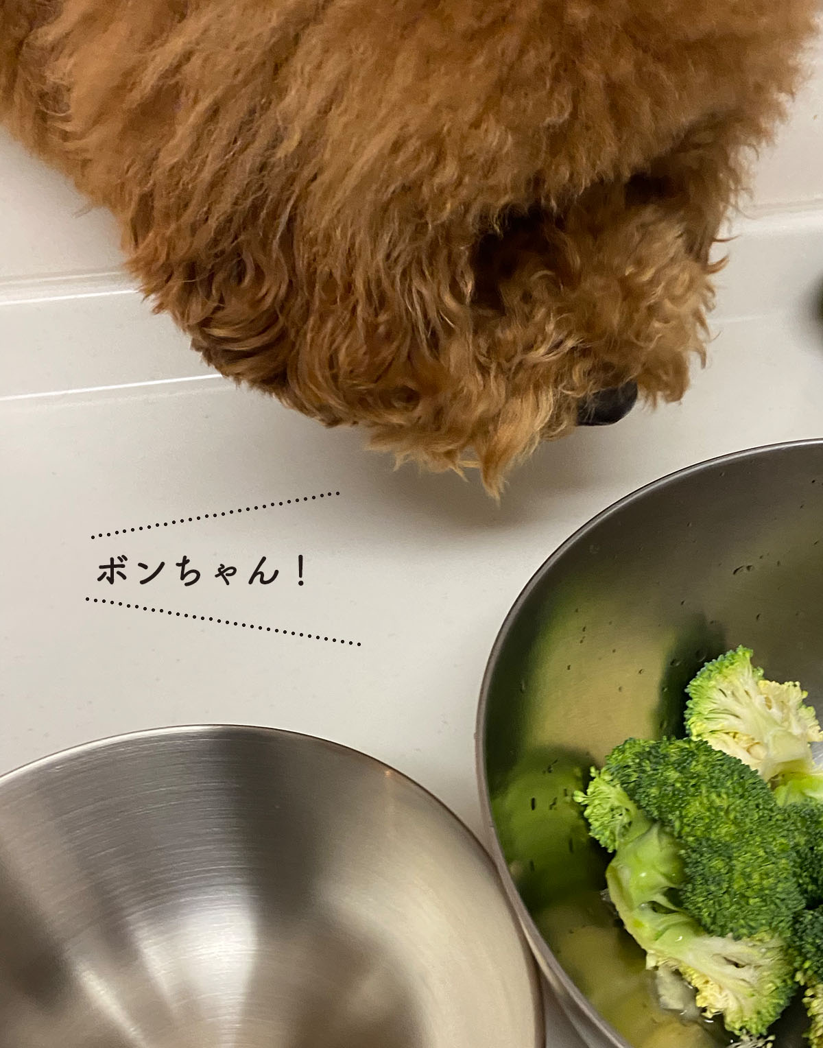 料理中、食いしん坊のボンちゃんが慌てて