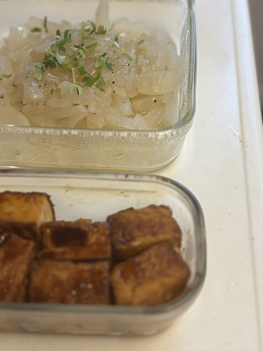しっかりと水を切った後、iwakiの容器に入れて味付け。