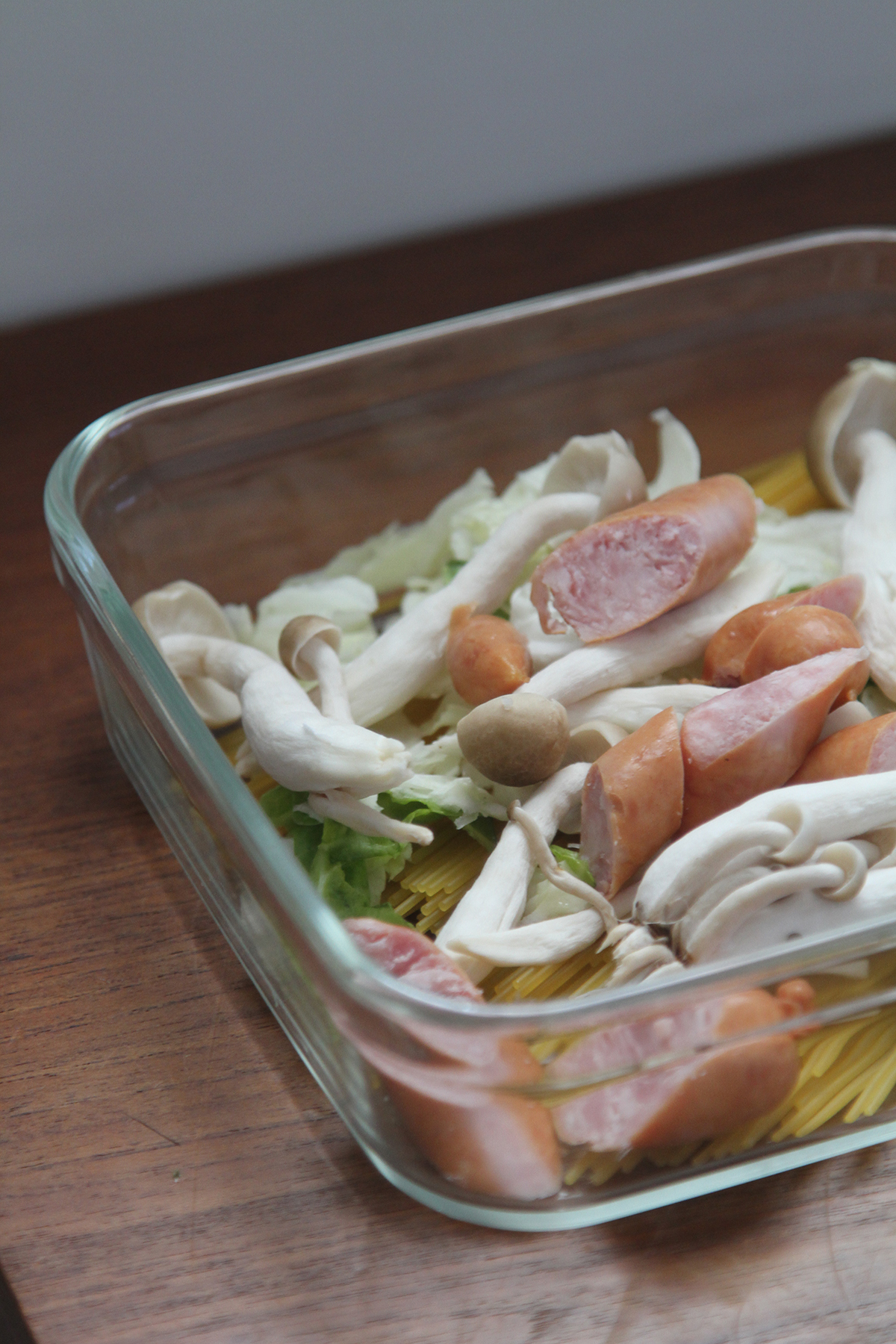 この中にお水250cc、顆粒コンソメ小さじ1弱、